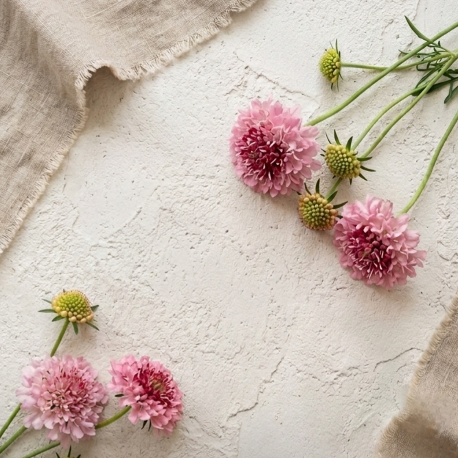 Praktvädd (Scabiosa atropurpurea) är en klassisk snittblomma med karaktäristiska kuddformade blommor på tunna, eleganta stjälkar. Populär som fokusblomma och texturgivare i arrangemang. Utmärkt vasliv och torkar även vackert.